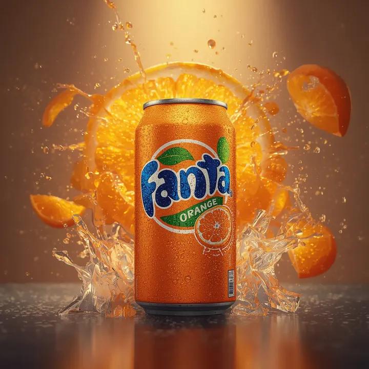 經典的 {argument name="drink brand" default="Fanta Orange"} 鋁罐超寫實電影級產品攝影,標誌完美置中且清晰可辨,罐身直立並略微朝前,冰冷且覆蓋著濃密的微凝結水珠,帶有自然的重力水痕和清晰的高光。罐身後方及周圍,新鮮的柳橙切片和柑橘楔形塊以慢動作向外爆裂,果汁飛濺在半空中凝結,帶有半透明的果肉纖維、微小水滴和捕捉光線的折射液體弧線。一個大型柔和模糊的柳橙橫截面形成背景光暈,增加深度和色彩和諧,同時不分散對罐身的注意力。燈光戲劇化且高級:溫暖的金黃背光穿透柑橘,冷色邊緣光勾勒出罐身邊緣和水珠,微妙的前方補光以保持標誌清晰度。淺景深帶有奶油般的散景,高對比度,罐身表面和凝結水珠紋理超清晰對焦。乾淨的攝影棚設置,沒有可見的支撐物,沒有文字疊加,沒有圖形元素,沒有邊框。色彩以鮮豔的橙色、冷銀色高光和柔和的中性背景色調為主。寫實材質,廣告級構圖,高端飲料廣告美學,凝結動作飛濺攝影,電影級寫實主義。可配置参数
