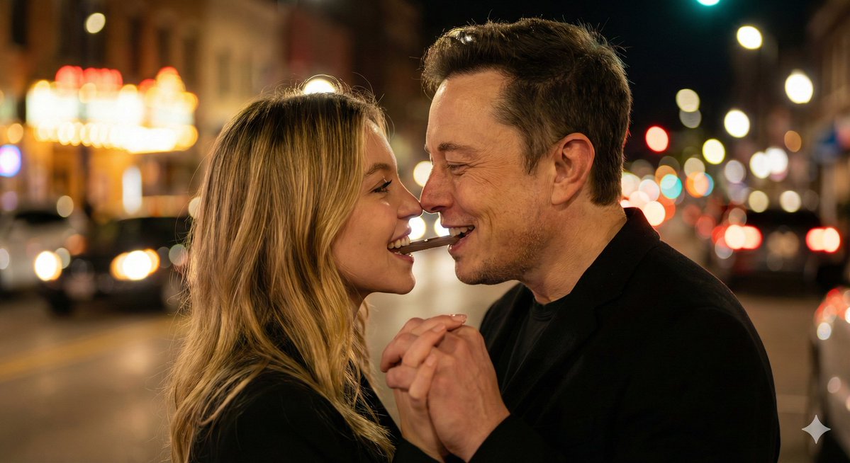 一對微笑的情侶,特寫側面,咬著同一條巧克力,鼻子相觸,雙手緊握,溫暖的夜晚街景散景燈光,淺景深,{argument name="lens" default="85mm"} 人像鏡頭,電影般的浪漫氛圍,柔和的鎢絲燈光,清晰的臉龐,模糊多彩的背景。可配置参数