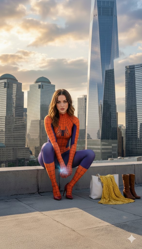 一個複雜的、多部分的提示,以烏爾都語/印地語(羅馬化)撰寫,描述了兩個獨立的超級英雄變體(蜘蛛女孩),她們分別酷似安娜·德·阿瑪斯(Ana de Armas)和席德妮·史威尼(Sydney Sweeney),詳細說明了她們獨特的服裝、姿勢,以及在黃金時段或逆光條件下,各自在紐約市的不同環境。