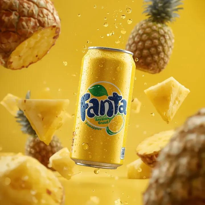 一個詳細且結構化的提示,用於生成超逼真、高階的商業產品攝影,內容為一個漂浮的霧面黃色鋁製汽水罐(芬達鳳梨口味),強調濃密的冷凝水、漂浮的水果元素,以及在無縫純黃色背景下呈現的熱帶鮮活感。